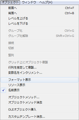 フォームエディター内ではスタティックエリアを編集モードにするか、オブジェクトメニューからフォーマット表示または名前表示を選択すると、実際の内容を見ることができます。: