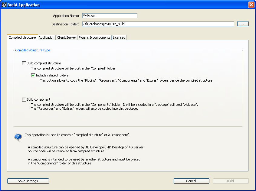 At the time of building, 4D will automatically create one or more intermediary folders (entitled “Compiled Database,” “Components,” “Final Application,” “Client Application” or “Server Application” according to the type of build requested) in the specified location. This avoids the risk of accidentally deleting files with the same name and enables several types of builds to be performed simultaneously.