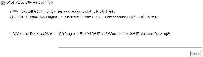 フォルダーが選択されるとその完全パス名が表示され、そこに4D Volume Desktopが含まれていればビルドボタンが有効になります:
