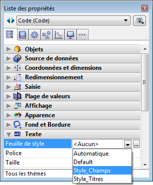 Les feuilles de styles définies sont utilisées dans la Liste des propriétés de L'Editeur de formulaires. Des feuilles de style peuvent être appliquées à tout objet, statique ou dynamique, comportant du texte : Boutons, Champs et variables objets, Onglets, List box, etc.