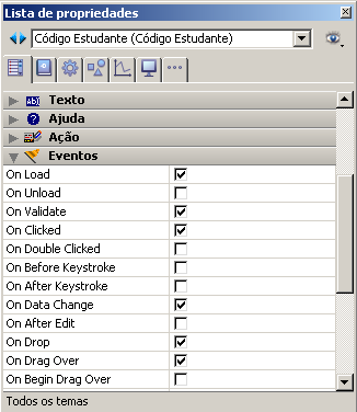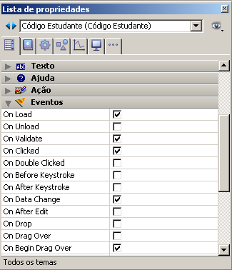 Para que a aplicação processe estes eventos, devem ter sido selecionados de uma forma adequada na Lista de Propriedades: