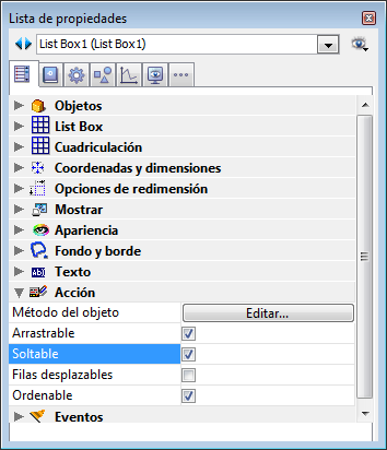 Cuando en un objeto de tipo List box, las propiedades “Arrastrable” y “Filas desplazables” están definidas simultáneamente, la propiedad “Filas desplazables” tiene prioridad cuando se mueve una fila. En este caso no es posible arrastrarlo.