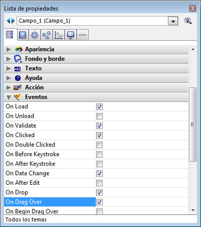 Para que la aplicación procese estos eventos, deben haber sido seleccionados de una forma adecuada en la Lista de Propiedades: