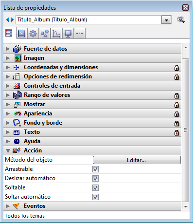 La siguiente imagen muestra la ventana de la Lista de propiedades con las propiedades Arrastrable y Soltable definidas para el objeto seleccionado: