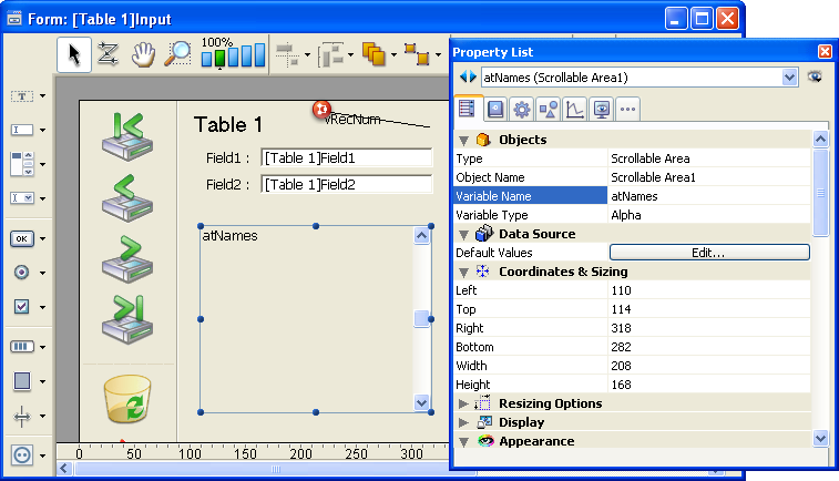 配列がフォームオブジェクトのサポートに使用される場合、この配列は、ランゲージオブジェクトとユーザインタフェースの2つの性質を併せ持ちます。例えば、フォームにスクロールエリアを作成します: