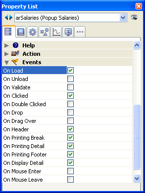 オブジェクトのOn Loadイベントを使用し、配列arSalariesを初期化します。これを行うには、次に示すように、プロパティリストウインドウでこのイベントを有効にします: