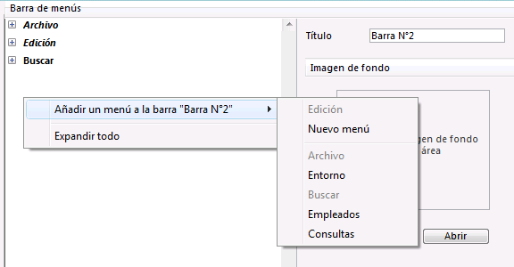 Una vez haya creado un menú, puede asociarlo a una barra de menús. La conexión de un menú a una barra de menús se efectúa por arrastrar y soltar, por el menú de opciones o por el menú contextual del área central.