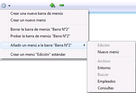 • Utilizar el menú contextual: haga clic en una barra de menús con el fin de mostrar su contenido en la lista central; haga clic derecho en esta área y seleccione el comando Añadir un menú a la barra “nombre barra” >, luego elija el menú a utilizar como submenú: