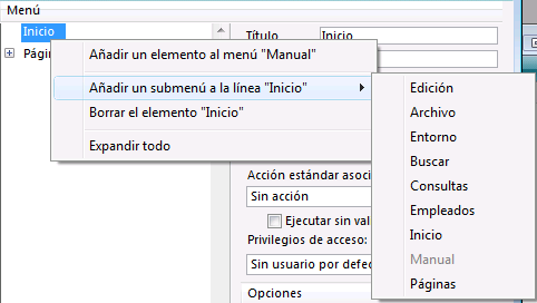 El menú que se está asociando se convierte entonces en un sub menú. El título de la línea se conserva (se ignora el nombre original del submenú), pero este título puede modificarse.