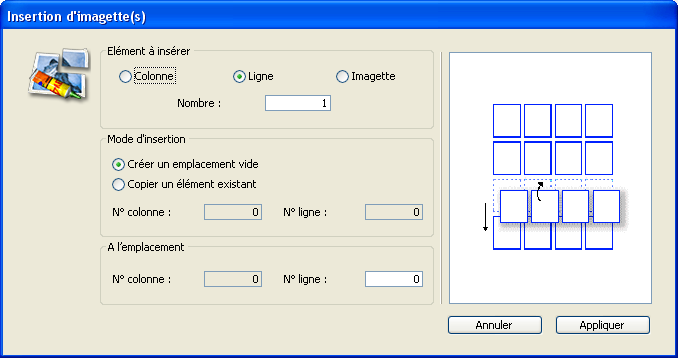 3. Définissez, dans la zone supérieure, le type d’élément que vous souhaitez insérer (colonne, ligne ou imagette individuelle) et indiquez le nombre d’éléments.