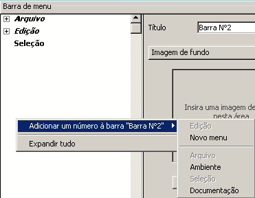 • Utilizar o menu opções: selecione uma barra de menus na lista à esquerda e logo clique no menu de opções localizado debaixo da lista; selecione o comando Associar um menu a barra “nome barra” >, logo escolha o menu a ser utilizado como sub-menu: