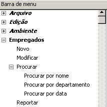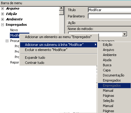 • Utilizar o menu contextual: clique em uma barra de menus para mostrar seu conteúdo na lista central, clique com o botão direito nesta área e selecione o comando Associar menu a barra “nome barra” >, logo escolha o menu a ser utilizado como sub-menu: