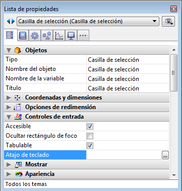 Puede asignar un atajo de teclado a Botones y Casillas de selección. El usuario puede activar el botón o seleccionar la casilla de selección utilizando el teclado en lugar del ratón.