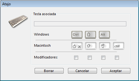 Escriba el atajo de teclado. Por ejemplo, si quiere utilizar Ctrl+H, mantenga presionada la tecla Ctrl y presione H. La letra h aparecerá entonces en el área Tecla asociada y la casilla de selección debajo de la tecla Ctrl se marcará. No es necesario utilizar modificadores. Puede utilizar cualquier tecla sola como atajo, aunque no es recomendable en la mayoría de los casos. Si lo desea, puede modificar manualmente la selección de teclas modificadoras seleccionando o deseleccionando cualquiera de las casillas de selección de las teclas modificadoras.