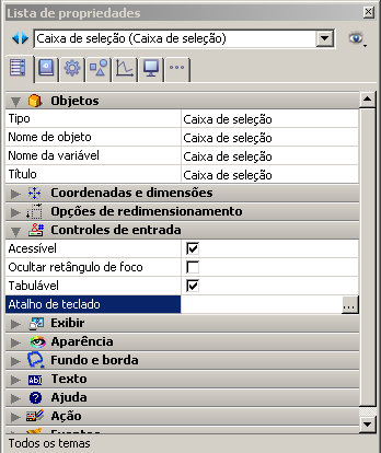 A lista de propriedades indica o atalho de teclado que foi atribuído ao objeto. Se mais adiante você quiser mudar o atalho, simplesmente abra a caixa de diálogo Atalhos e escreva a combinação de teclas a ser utilizada.