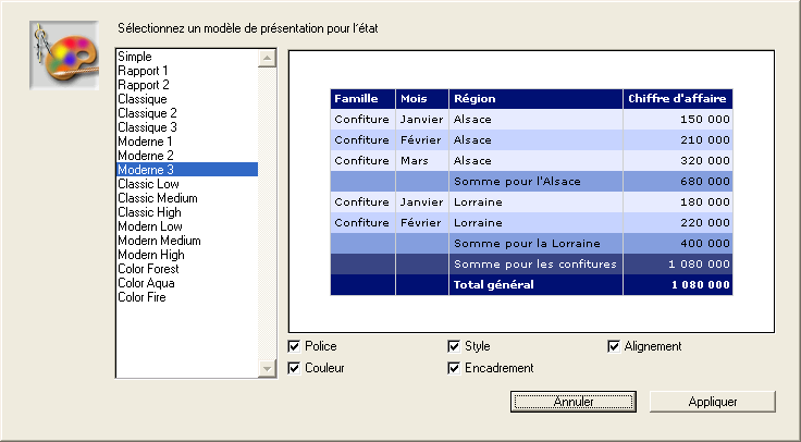 L’éditeur d’états rapides contient un ensemble de modèles prédéfinis proposant diverses approches graphiques pour la réalisation d’états imprimés ou HTML. Vous pouvez utiliser la totalité d’un modèle ou vous en inspirer pour construire vos propres états. Vous pouvez appliquer un modèle à tout moment.