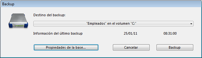 El botón Propiedades de la base provoca la visualización de la caja de diálogo de las Propiedades de la base (Página Backup/Configuración).