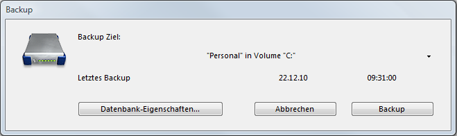 Über das PopUp-Menü neben "Backup Ziel" sehen Sie den Speicherort des Backup-Ordners. Diesen legen Sie auf der Seite Backup/ Konfiguration der Datenbank-Eigenschaften fest.