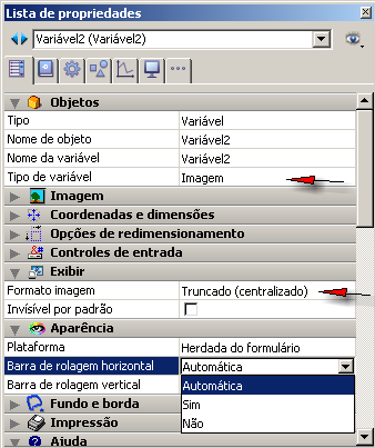 Neste caso, as propriedades Barra de rolagem horizontal e Barra de rolagem vertical são ativadas na Lista de propriedades para o objeto imagem. Cada propriedade é definida utilizando um menu com três opções: