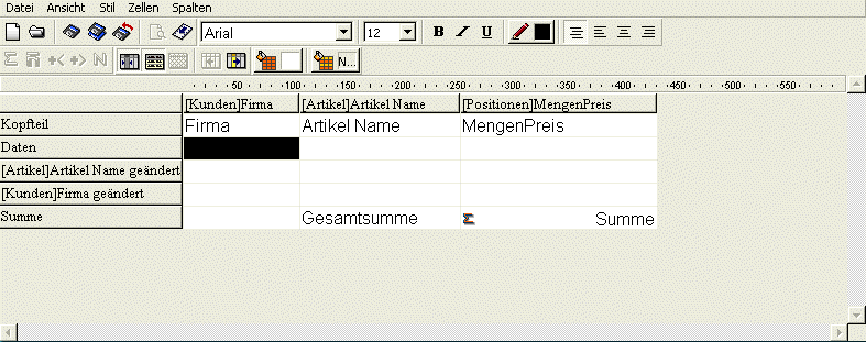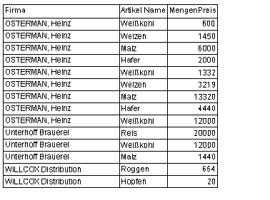 Im folgenden sehen Sie den o.a. Bericht mit Wiederholten Werten, d.h. der Name der Firma wird für jeden Datensatz angezeigt: