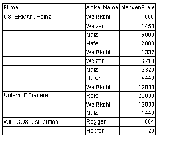 Beim Drucken dieses Berichts werden die Werte in der Umbruchspalte nur einmal pro Umbruch gedruckt, d.h. der Name der Firma wird pro Gruppe nur jeweils für den ersten Datensatz gedruckt und nicht für jeden Datensatz wiederholt.