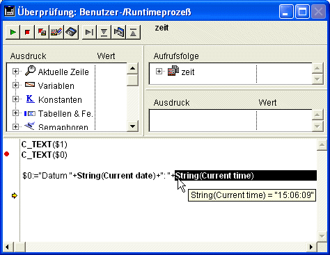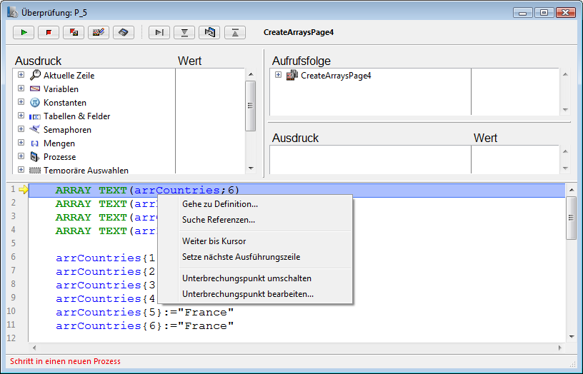 - Haben Sie an irgendeiner Stelle einen Aufruf TRACE eingebaut und Sie klicken auf die Schaltfläche Weiter, wird die Ausführung bis zu diesem Aufruf fortgeführt.