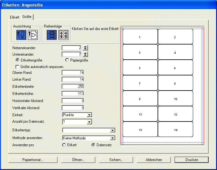 • Größe: Diese Seite enthält Optionen zum Anordnen der Etiketten auf der Seite und zum Drucken. Das können Sie selbst ausführen oder das Programm berechnen lassen, wieviel Etiketten auf die Seite passen. Sie können der Seite auch eine Methode zuordnen.