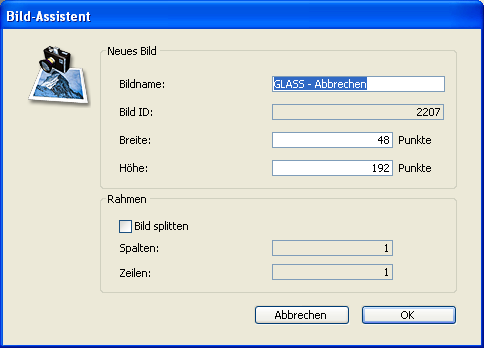 Hinweis: Sie können diese Nummer beim Erstellen des Bildes festlegen, sie dann später aber nicht mehr ändern. - Breite und Höhe: Hier bestimmen Sie die Bildgröße. Diese Werte sind bereits berechnet, wenn Sie ein Bild aus einer Datei oder der Zwischenablage importieren. Splitten Sie das Bild (siehe unten), entsprechen die Werte der Größe des einzelnen Rahmens.