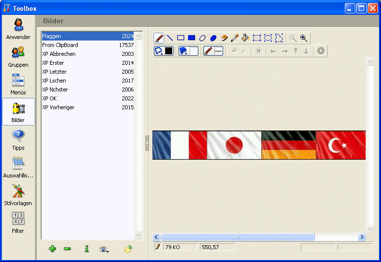 Als Bildschaltfläche, die den Benutzer zwischen mehreren Optionen wählen lässt. In diesem Fall kann die Schaltfläche anstelle eines PopUp-Bildmenüs verwendet werden. Über PopUp-Menü vom Typ Bild erscheinen alle Wahlmöglichkeiten gleichzeitig (wie die Einträge im PopUp-Menü), während die Bildschaltfläche die Wahlmöglichkeiten nacheinander anzeigt (Wenn der Benutzer auf die Schaltfläche klickt). Es folgt ein Beispiel für eine Bildschaltfläche. Angenommen, Sie wollen dem Benutzer einer eigenen Anwendung die Möglichkeit geben, die Sprache für die Anwendung auszuwählen. Sie binden die Option als Bildschaltfläche in Ihr eigenes Dialogfenster Eigenschaften wie folgt ein: Durch Anklicken des Objekts ändert sich das Bild.