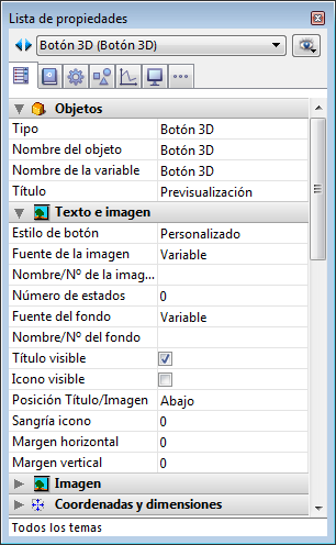 Al igual que los botones de imagen, el icono de un botón 3D puede venir de tres fuentes diferentes: Variable, Librería de imágenes, Archivo de recursos o Archivo. Una vez designada la fuente, puede introducir el nombre o el número de imagen en la propiedad "Nombre/No de la imagen".