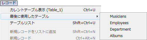 レコードメニューの最後に使用したテーブルサブメニューからテーブルを選択します。
