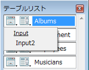 ウィンドウ中の各テーブルの左には入力フォームと出力フォームを表す2つのアイコンが表示されます。左のアイコンをクリックすると入力フォームのリストが表示され、右側のアイコンをクリックすると出力フォームのリストが表示されます。