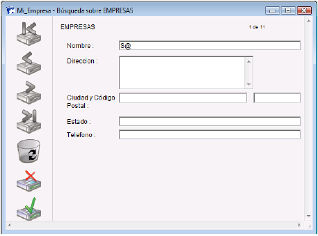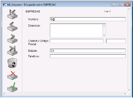 La siguiente imagen muestra una ventana Buscar por formulario utilizada para buscar todas las empresas cuyo nombre comienza por “S”.