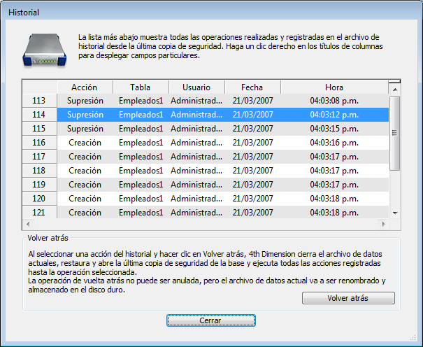 Nota: como la función Volver atrás es relativamente poderosa, es recomendable restringir el acceso al comando CHECK LOG FILE de los administradores de la base.