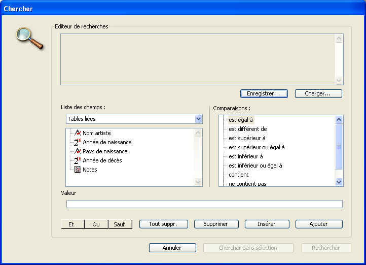 Note : Il est possible de définir le comparateur sous la forme d'une expression alphanumérique au lieu d'un symbole. Dans ce cas, il est obligatoire d'utiliser des points-virgules pour dissocier les éléments de la chaîne de recherche. Ce principe permet par exemple de créer des séquences de recherches paramétrables en faisant varier le comparateur, ou de construire des interfaces de recherche utilisateur personnalisées. Reportez-vous à l'exemple 19.