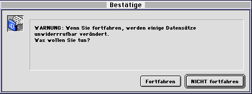 CONFIRM("WARNUNG: Wenn Sie fortfahren, werden einige Datensätze "+"unwiderrufbar verändert."+Char(13)+"Was wollen Sie tun?";"NICHT fortfahren";"Fortfahren")zeigt folgende Meldung auf dem Bildschirm (auf Macintosh):