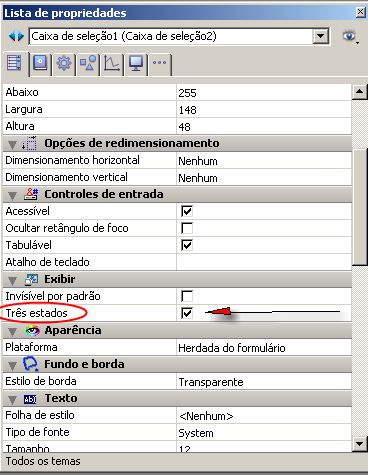 Para que uma caixa de seleção tome controle deste terceiro estado, você deve definir a propriedade Três estados no tema “Exibir” da Lista de propriedades: