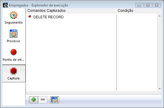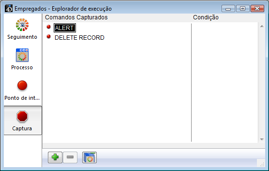 Capturar um comando é uma forma conveniente para rastrear grandes porções de código sem definição de break points em locais arbitrários. Por exemplo, se um registro que não deve ser excluído é excluído após ter executado um ou vários processos, você pode tentar reduzir o seu campo de investigação pela captura comandos como DELETE RECORD e DELETE SELECTION.Cada vez que esses comandos são chamados, você pode verificar se o registro em questão foi excluído, e, portanto, isolar a parte defeituosa do código.