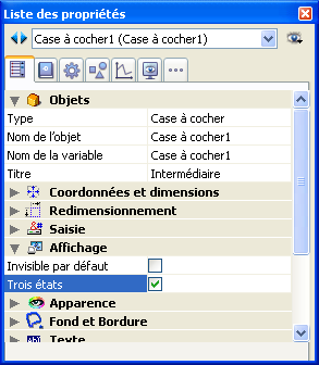Pour qu’une case à cocher prenne en charge ce troisième état, vous devez lui attribuer la propriété Trois états dans la Liste des propriétés, thème “Affichage” :