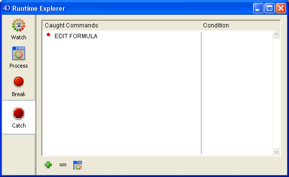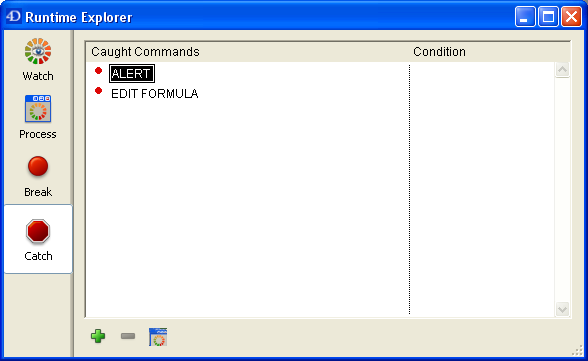 The Caught Commands List is a page of the Runtime Explorer that enables you to add additional breaks to your code by catching calls to 4D commands.