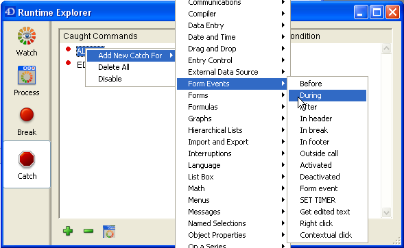 Catching a command is a convenient way to trace large portions of code without setting break points at arbitrary locations. For example, if a record that should not be deleted is deleted after you have executed one or several processes, you can try to reduce the field of your investigation by catching commands such as DELETE RECORD and DELETE SELECTION. Each time these commands are called, you can check if the record in question has been deleted, and thus isolate the faulty part of the code.
