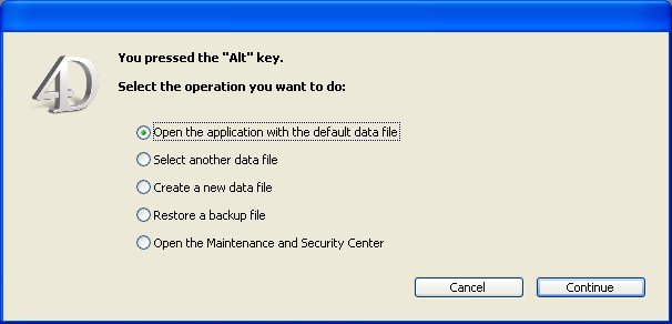 - データベース開始時にAlt (Windows) または Option (Mac OS) キーを押します。以下のダイアログボックスが表示されます: