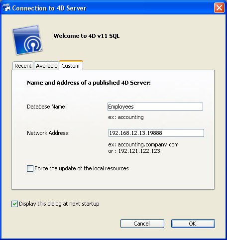 4D Server または 4Dからこの値を変更すると、データベースに接続しているすべての4Dマシンに変更が通知されます。接続していないクライアントを更新するには、次回の接続時、接続ダイアログボックスのカスタムページにサーバマシンのIPアドレスに続けてコロン、そして新しいポート番号を入力します。例えば新しいポート番号が19888であるとき: