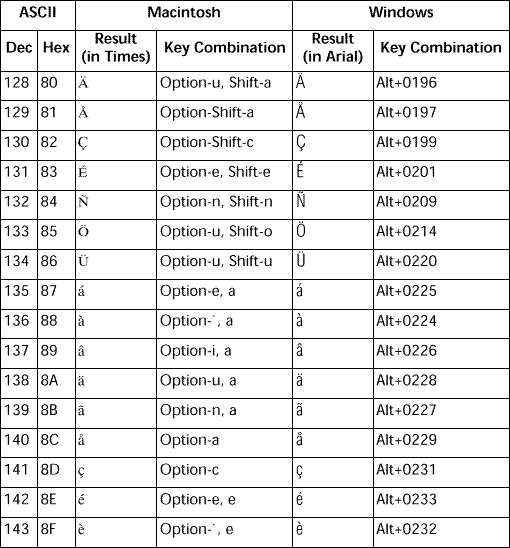 • A tabela padrão dos códigos ASCII (0 a 127), é idêntica para as plataformas Windows e Macintosh. Estes códigos ASCII padrão são listados em  ASCII Codes 0..63 e ASCII Codes 64..127.