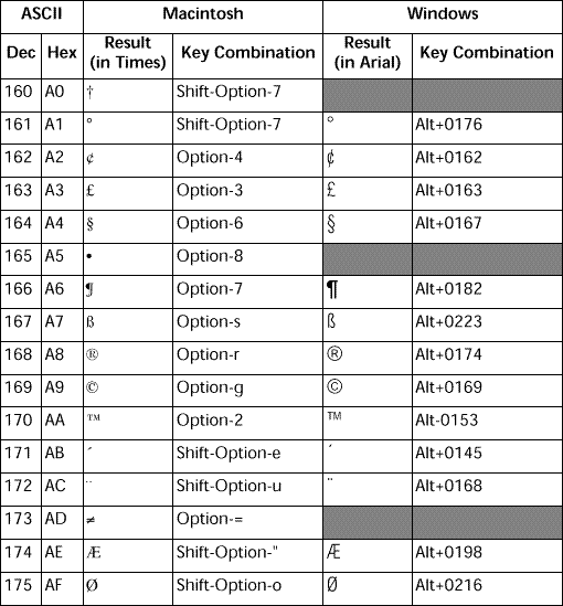 Nota: As caixas cinzas indicam os caracteres que não estão disponíveis em Window ou que são diferentes dos caracteres Macintosh.