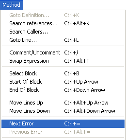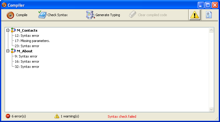 エラーが検出されなければ、実際のコンパイルが開始します。エラーが検出されると、処理が中止され、問題となるメソッド名と行番号がウインドウの情報エリアに階層リスト形式で表示されます: