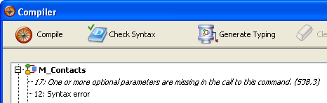 コンパイラーウインドウを表示するには、デザインメニューのシンタックスチェック...コマンドを選択するか、またはデザインモードのツールバーにあるコンパイラーボタンをクリックします: