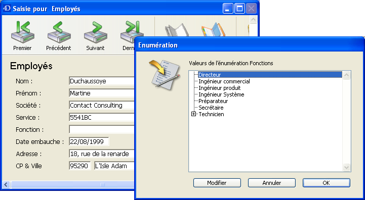 4D vous permet de rendre les valeurs d’une énumération obligatoires ; cette contrainte prend la forme d’un contrôle de saisie lié à un formulaire. Ce type de contrôle de saisie empêche un utilisateur de saisir une valeur autre que celles de l’énumération. Par exemple, votre société peut avoir un groupe spécifique de titres de postes qui sont autorisés dans la base de données du personnel.