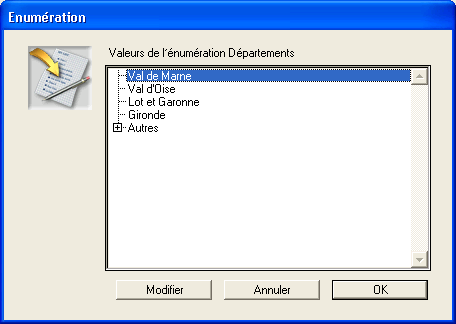 Vous pouvez aussi associer l’énumération à un champ sous la forme d’un contrôle de saisie dans un formulaire (cf. section Contrôles et aides à la saisie). L’énumération n’apparaîtra que lorsque le champ sera sélectionné dans ce formulaire de saisie. L’exemple ci-dessous représente une énumération en cours d’affichage.