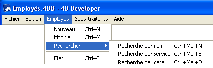 Le langage de 4D permet de créer et de gérer des barres de menus et des menus entièrement par programmation, sans recourir à l’éditeur de menus. Pour plus d'informations sur la gestion des menus par programmation, reportez-vous au chapitre Menus dans le manuel Langage de 4D.